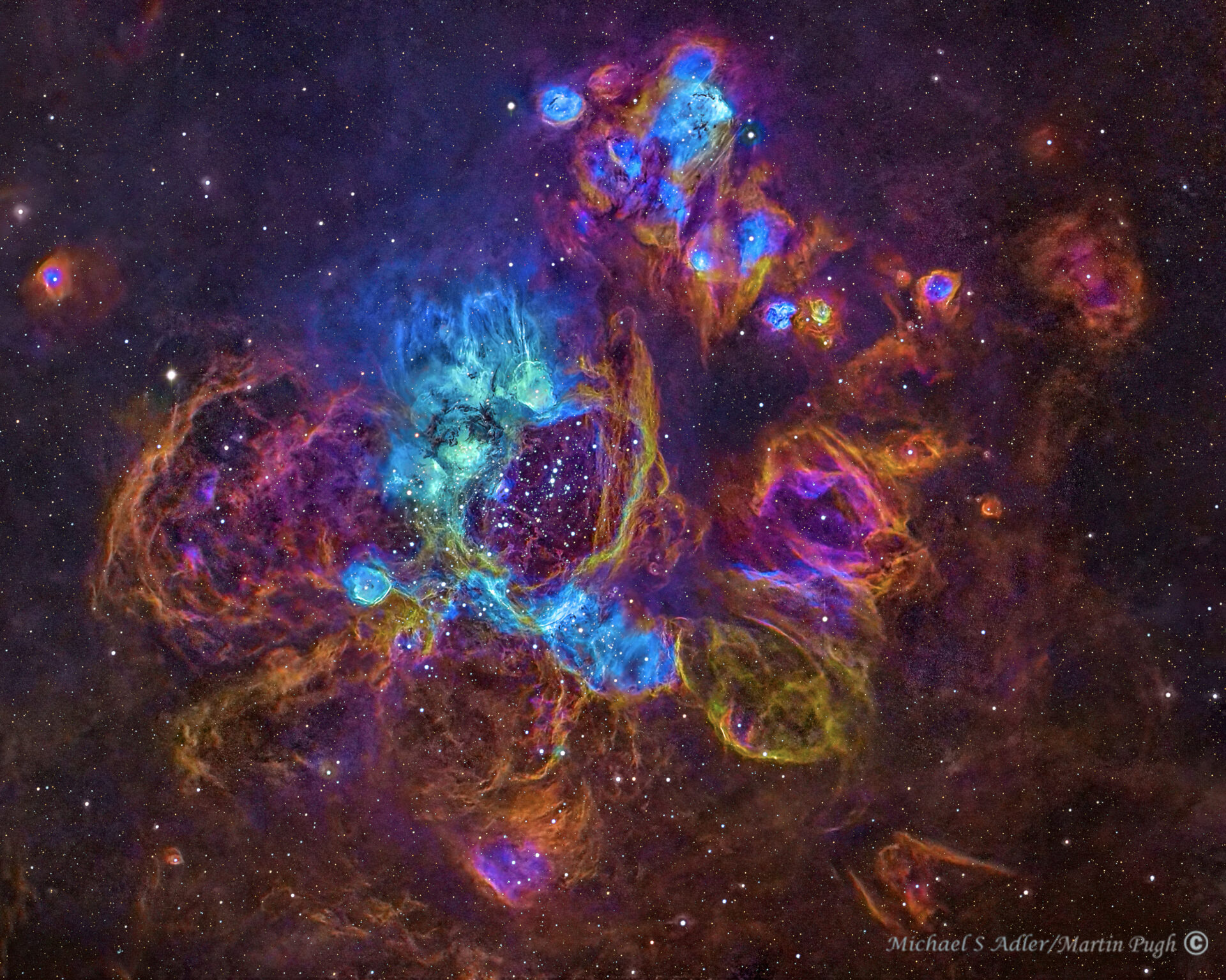 N44, Superbubble This image is located in the Large Magellanic Cloud which is a small satellite galaxy of the Milky Way located about 160,000 light years from Earth in the Dorado constellation in the deep southern sky. N 44 itself is about 1000 light years in size. The superbubble structure of N44 itself is shaped by the radiation pressure of a 40-star group located near its center; the stars are blue-white, very luminous, and incredibly powerful. The massive stars produce intense radiation, expel matter at high speeds, and race through their evolution to explode as supernovas. The winds and supernova shock waves carve out huge cavities called superbubbles in the surrounding gas.  Many new stars, some of them very massive, are forming in the star cluster NGC 1929, which is embedded in the nebula N44, so named because it is the 44th nebula in a catalog of such objects in the Magellanic Cloud. N44 is classified as an emission nebula because it contains large regions of  Hydrogen, Sulfur and Oxygen gas which are excited by the nearby stars. The Red color in the image comes from  Hydrogen atom emission, Blue from Oxygen emissions and Green from sulfur emissions.CDK24 used for luminance and stars, RH305 for color