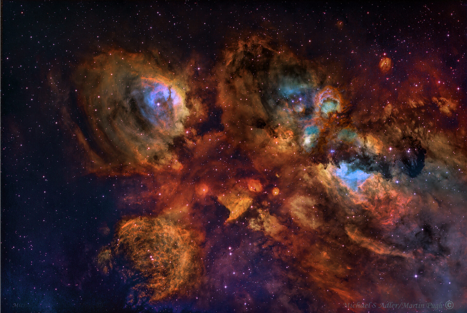 NGC 6334, Cat’s Paw Nebula,JWST Overlay(Hubble Palette)
