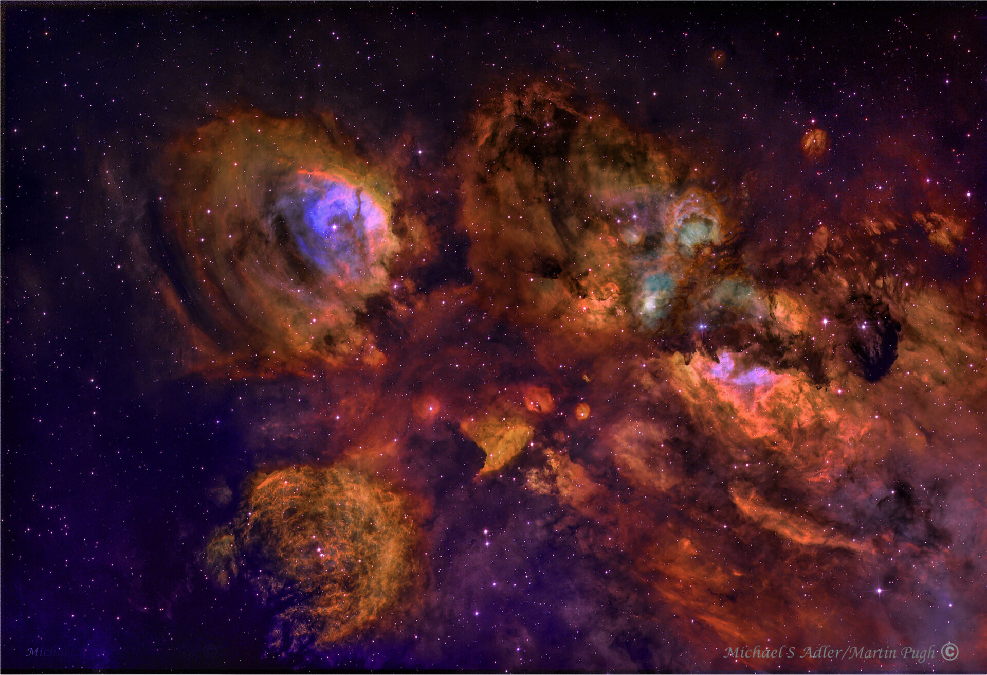 NGC 6334, Cat’s Paw Nebula, Hubble Palette  Nebulas are perhaps as famous for being identified with familiar shapes as perhaps cats are for getting into trouble. Still, no known cat could have created the vast Cat’s Paw Nebula visible in Scorpius. At 5,500 light years distant, Cat’s Paw is an emission nebula with a red color that originates from an abundance of ionized Hydrogen atoms which are excited by uv light from nearby stars. However, this image is in false color in the Hubble palette where the Hydrogen is green. Alternatively known as the Bear Claw Nebula or NGC 6334, stars nearly ten times the mass of our Sun have been born there in only the past few million years. Framed by orangish clouds, the blue-green bubbles are the dominant feature in the image. After gas and dust inside the nebula collapse to form stars, the stars may in turn heat up the pressurized gas surrounding them, causing it to expand into space and create bubbles. The Cats Paw occupies about 3/4 of a degree in the sky(less than two moon diameters). At a distance of 5500 light years this makes it 70 light years in actual size. This false color image is made up by light emitted by hydrogen(green), oxygen(blue), and sulfur(red) atoms.  It was discovered by astronomer John Herschel in 1837, who observed it from the Cape of Good Hope in South Africa. The nebula is located in the Carina -Sagittarius arm of the Milky Way. Companion images show the Cats Paw done by the JWST telescope. A special feature of this image is that the JWST image is superposed on the image. By going back to the previous image you can see the difference between what an optical and infrared view of that region looks like.