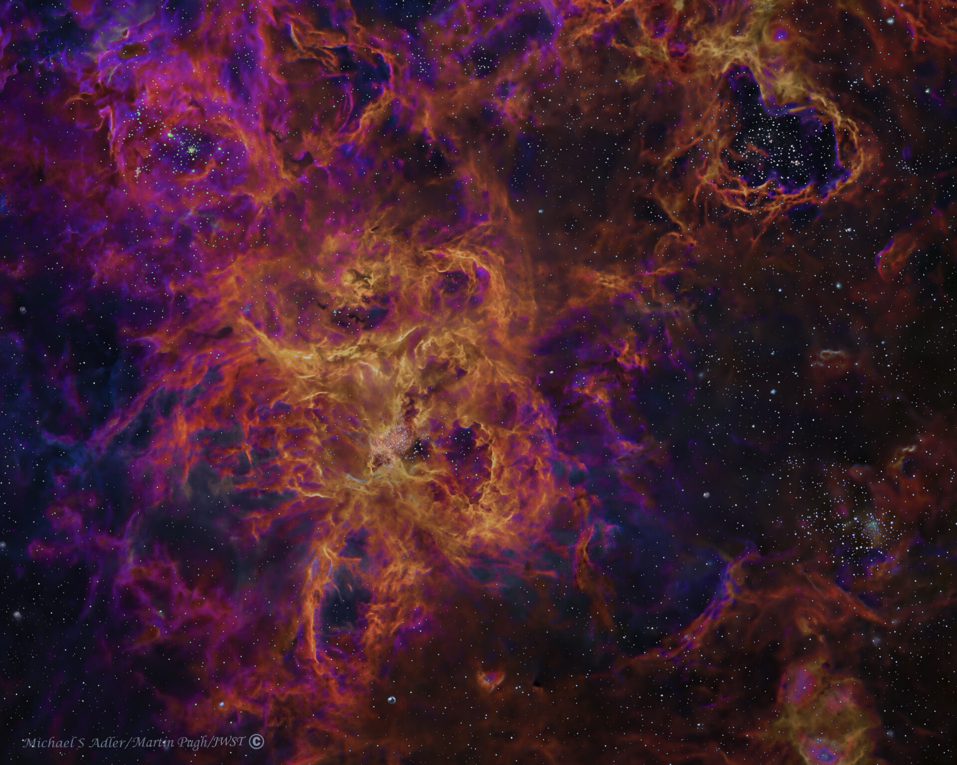 The Tarantula Nebula, NGC 2070  The Tarantula Nebula is more than a thousand light-years in diameter, a giant star forming region within nearby satellite galaxy the Large Magellanic Cloud. It is located at a declination of -69 degrees which is the celestial version of latitude and is only visible from the Southern Hemisphere.   About 180 thousand light-years away, it’s the largest, most violent star forming region known in the whole Local Group of galaxies. This distance is further away than any part of the Milky Way itself which is 110 thousand light years in size. The cosmic arachnid sprawls across this spectacular view, done with  atomic emission imaging.It also has a shape of a butterfly. The dominant red color is due to Hydrogen  emission, the yellow color is due to a mix of green from Sulfur emission and the red from the Hydrogen, and the blue is from oxygen emission. Within the Tarantula, intense radiation, stellar winds and supernova shocks from the central young cluster of massive stars,  energize the nebular glow causing the emission and shape the spidery filaments. Around the Tarantula are other star forming regions with many young star clusters, filaments, and blown-out bubble shaped clouds. The dominant large cluster in the lower right is NGC 2100. Above the central Tarantula nebula are two smaller nebulas with star clusters NGC 2050(left) and NGC 2081(right) inside of them The rich field of view spans about 1 degree or 2 full moons, in the southern constellation Dorado. But were the Tarantula Nebula closer, say 1,500 light-years distant like the local star forming Orion Nebula it would take up half the sky. The image data was taken from a remote telescope located at Heavens Mirror in New South Wales Australia and assembled in Jackson Hole into the image here .